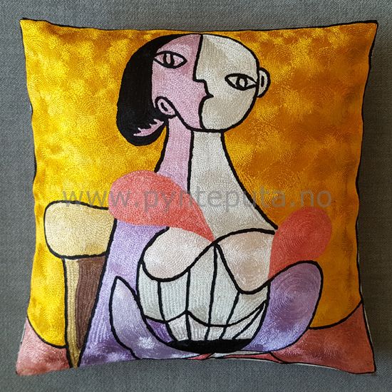 Putetrekket er brodert med kjedesting, og har et tøft og stilig design med moderne, abstrakt motiv som skaper en spennende detalj i interiøret ditt. Her er det brukt en flott miks av sterke farger og et stilig abstrakt motiv som spenner fra dype mørke farger og til lyse og gyldne farger. Hovedfargen er skarp gull med elementer i lys mosegrønn, lilla, rosa, brun, hvit og svart. Putetrekket er laget av silke og bomull brodert på bomullslerret.