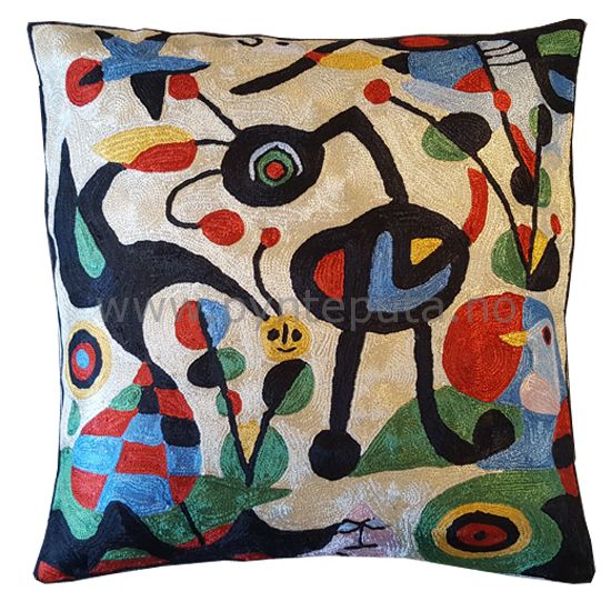 Putetrekket er brodert med kjedesting, og har et tøft og stilig design som er inspirert av moderne, abstrakt kunst. Puten har en nydelig gyldenhvit bakgrunnsfarge, med elementer i sort, hvit, rustrød, blå, grønn, gul og rosa. Det abstrakte uttrykket og bruk av farger skaper en spennende detalj i interiøret ditt. Putetrekket er laget av silke og bomull brodert på bomullslerret .