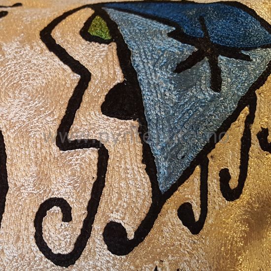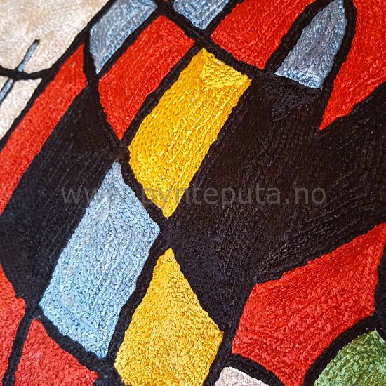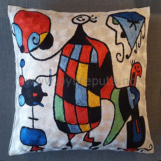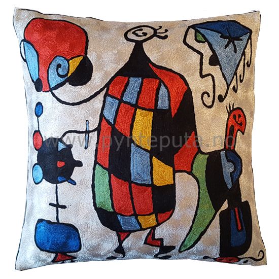 Puten er brodert med kjedesting, og har et tøft og stilig design som er inspirert av moderne, abstrakt kunst. Denne pynteputen har dristige fargene og barnslig motiv som er karakteristisk for kunstneren Miro. Det abstrakte uttrykket og bruken av spennende farger, skaper en spennende detalj i interiøret ditt. Fargene som er brukt er gullfarge, rustrød, lyseblå og blå, grønn og svart. Putetrekket er laget av silke og bomull brodert på bomullslerret.